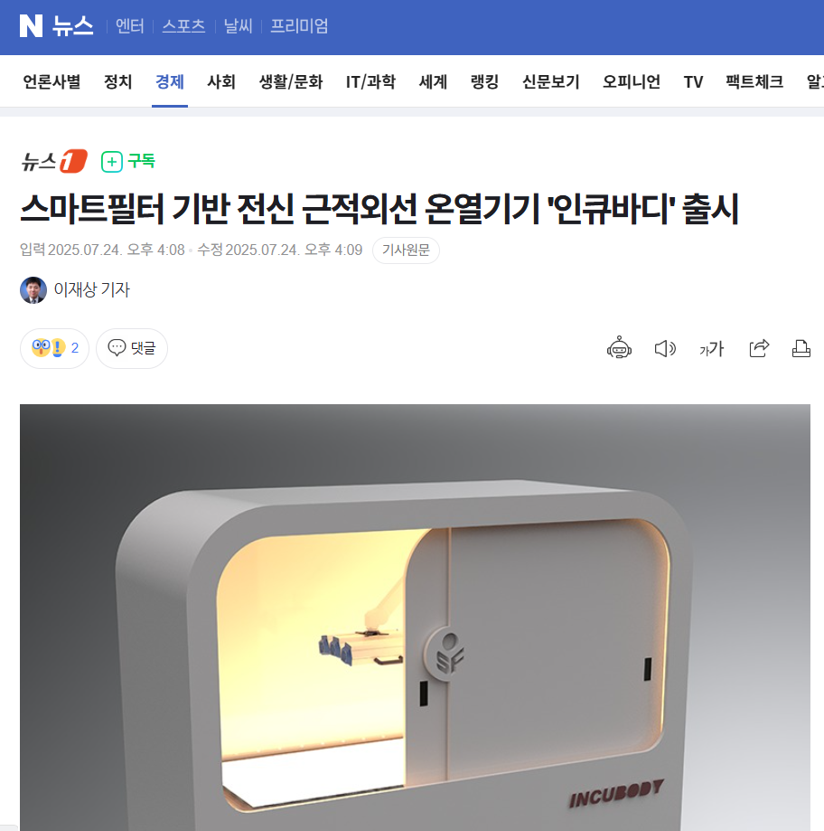 (주)인큐바디에서 출시한 근적외선 온열기기 출시 뉴스가 뉴스1 매체에 보도되었습니다. 네이버, 다음 등의 포털 사이트에서 ‘인큐바디’를 검색해서 뉴스 기사를 확인하실 수